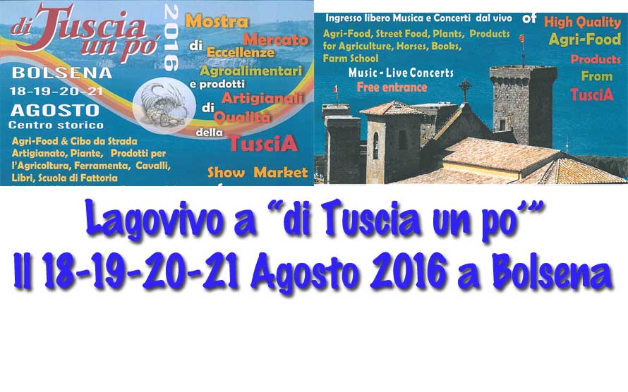 Lago Vivo sara' presente con tutte le sue fantastiche degustazioni a Bolsena dal 18 al 21 Agosto nell'ambito della 6^ edizione della manifestazione "di Tuscia un po' 2016". Vi aspettiamo tutti per festeggiare insieme alla grandiosa "Compagnia delle Lavandaie".