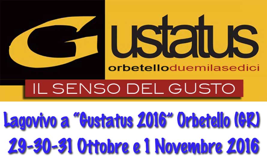 Lago Vivo sara' presente con tutte le sue fantastiche degustazioni a Orbetello (GR) i giorni 29-30-31 Ottobre e 1 Novembre 2016 nell'ambito della manifestazione "Gustatus 2016". Vi aspettiamo tutti per assaggiare i nostri splendidi prodotti.